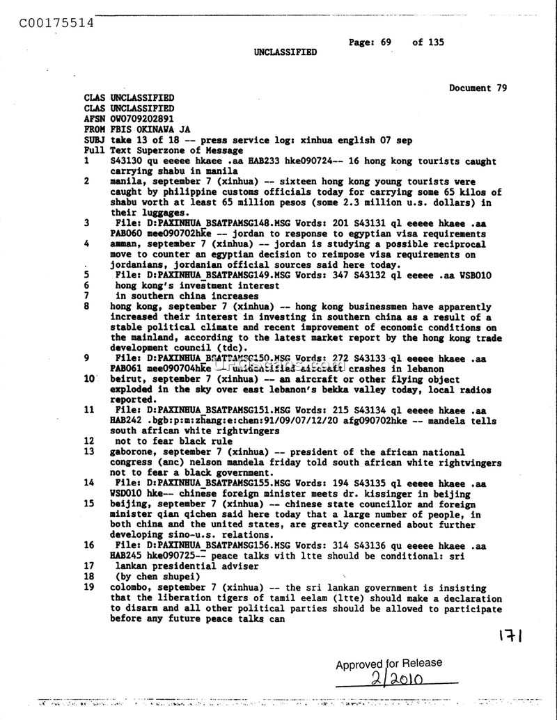 This document is a press service log from FBIS Okinawa, dated September 7, 1991, containing summaries of various news reports. The log covers international events, including the arrest of Hong Kong tourists in Manila for drug smuggling, Jordanian-Egyptian visa relations, and increased investment by Hong Kong businessmen in southern China. Notably, the log includes a brief report stating that an unidentified aircraft or flying object exploded in the sky over the Bekka Valley in Lebanon, as reported by local radios. Other entries cover political developments, such as Nelson Mandela addressing South African white right-wingers, a meeting between the Chinese foreign minister and Dr. Kissinger in Beijing, and the Sri Lankan government's stance on peace talks with the Liberation Tigers of Tamil Eelam (LTTE).