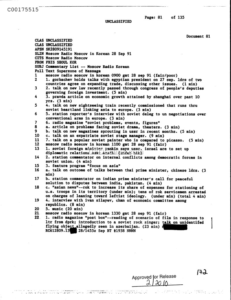 This document is a commentary list produced by FBIS Seoul on September 28, 1991, detailing the content of Moscow Radio broadcasts in Korean. The document outlines various news segments, including political updates regarding Mikhail Gorbachev's talks with the Egyptian president, economic discussions concerning foreign investment laws, and reports on Soviet economic growth. It also covers international relations, such as the upcoming establishment of diplomatic ties between the USSR and Israel, and internal Soviet affairs, including an interview with Ivan Silayev regarding the economic committee among republics. Notably, the final entry in the broadcast list mentions a radio magazine segment titled 'post box,' which includes a reading of a film scenario in response to a letter from the DPRK, an introduction to a Soviet rock singer, and a report on an unidentified flying object allegedly seen in Azerbaijan.