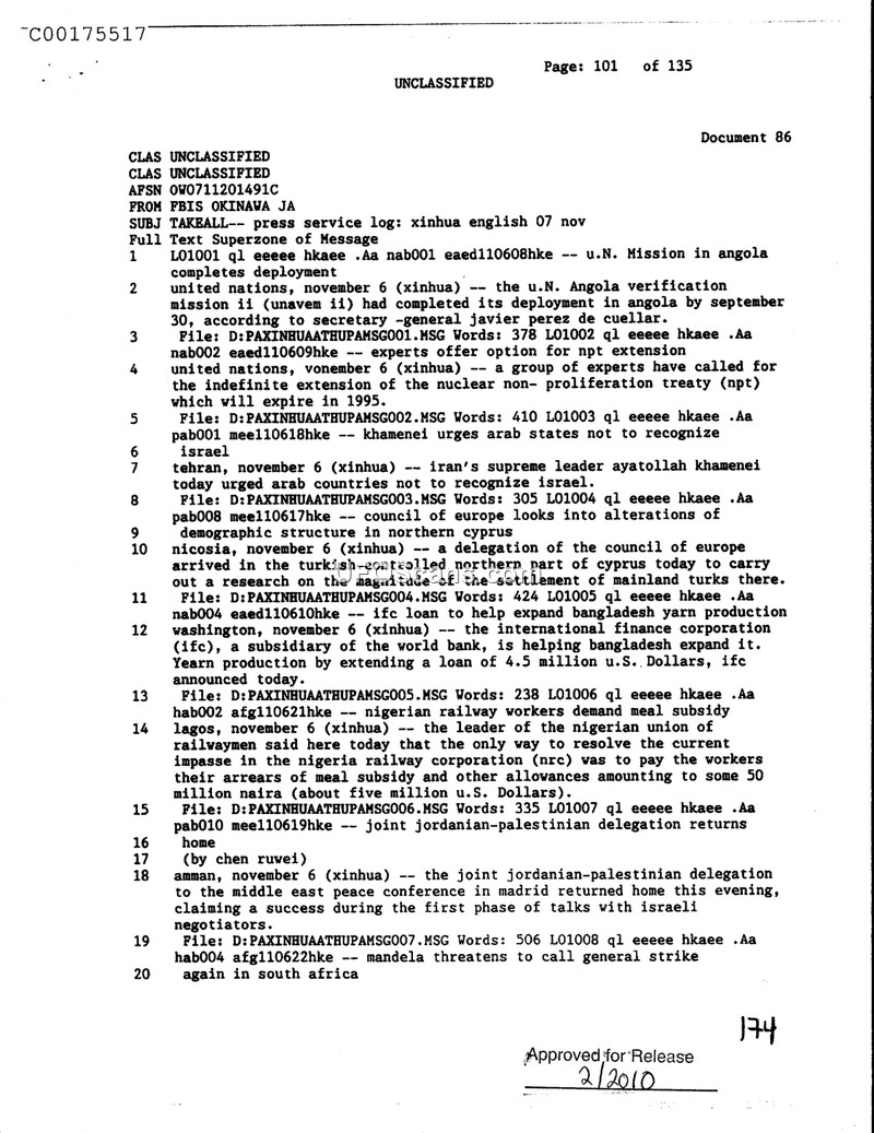 This document is a press service log compiled by FBIS Okinawa on November 7, 1991, containing summaries of various international news reports originally issued by Xinhua. The log covers several geopolitical developments occurring in early November 1991. Key items include the completion of the United Nations Angola Verification Mission II, as reported by Secretary-General Javier Perez de Cuellar. A group of experts is noted to have called for the indefinite extension of the Nuclear Non-Proliferation Treaty. In the Middle East, Iranian Supreme Leader Ayatollah Khamenei urged Arab nations not to recognize Israel. A delegation from the Council of Europe arrived in the Turkish-controlled northern part of Cyprus to research the demographic settlement of mainland Turks. The International Finance Corporation, a subsidiary of the World Bank, announced a 4.5 million U.S. Dollar loan to Bangladesh to support yarn production. In Nigeria, the leader of the Nigerian Railway Corporation workers demanded the payment of meal subsidies and other allowances to resolve a labor impasse. Finally, the document notes that a joint Jordanian-Palestinian delegation returned from peace talks in Madrid, and that Nelson Mandela threatened to call for a general strike in South Africa.