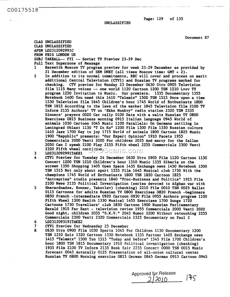 This document, issued by FBIS London, provides a detailed television program preview for Soviet Central Television (CTV1) and Russian TV for the week of December 23–29. The schedule is based on information provided by the December 21 edition of SEM DNEY, with all times listed in Moscow time (GMT + 2). The document outlines various programs, including news, cultural segments, children's programming, and films. Notably, the schedule includes a political investigation series focused on the Afghan war, featuring Shevardnadze, Bonner, and Yakovlev. The BBC is noted as having committed to covering and processing additional programs from these channels for checking purposes. The document serves as an informational summary of Soviet media content for the specified week.