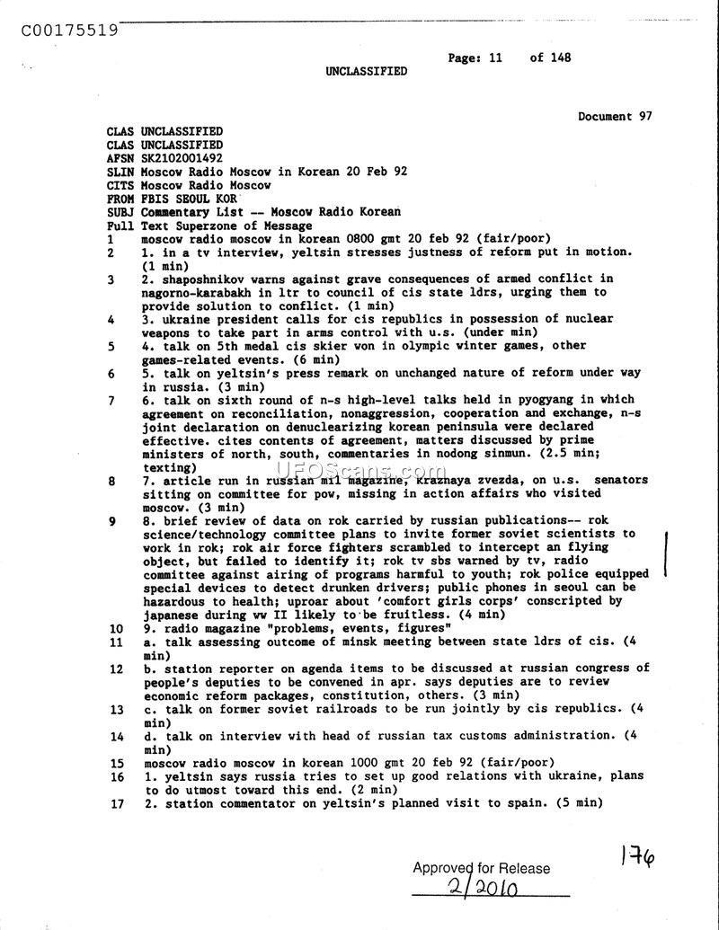 This document is a summary of a 1992 Moscow Radio broadcast. It briefly notes an incident where ROK Air Force fighters failed to identify an intercepted flying object.