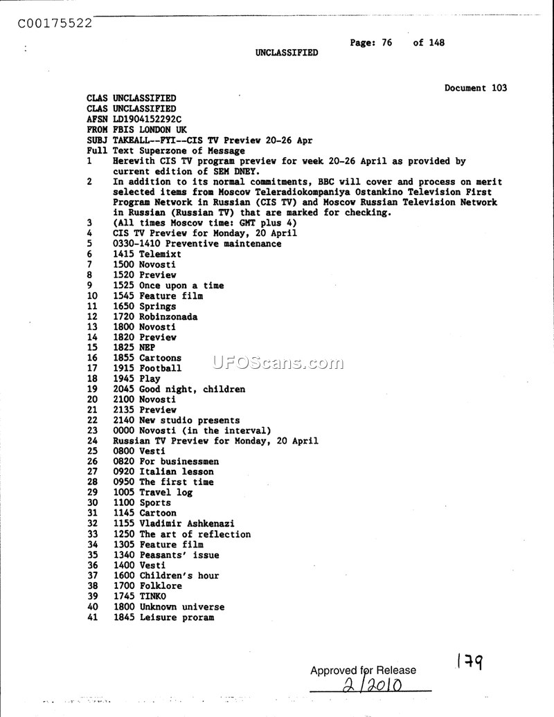 This document is an FBIS television program preview for CIS and Russian TV for the week of April 20-26. It details the broadcast schedule for Monday, April 20.