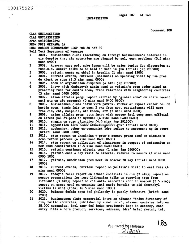 This document is a Foreign Broadcast Information Service (FBIS) commentary list from Okinawa, Japan, dated 30 May 1992. It provides a summary of various news reports and media segments concerning political and economic developments in Russia and the Commonwealth of Independent States (CIS). The list covers 21 distinct items, including discussions on foreign business interests in the CIS, upcoming Russian-U.S. summit topics involving nuclear issues, Boris Yeltsin's meetings and travels, and the political situation in Myanmar. Notably, item 3007 mentions an Asian affairs program on 'Global Echo' that featured a report on China's recent national meeting on UFO research. Other topics include the collection of signatures for a new Russian constitution, ethnic conflicts in the CIS, and the publication of an industrial directory for the CIS and Baltic countries. The document serves as a daily digest of broadcast content for intelligence or monitoring purposes.