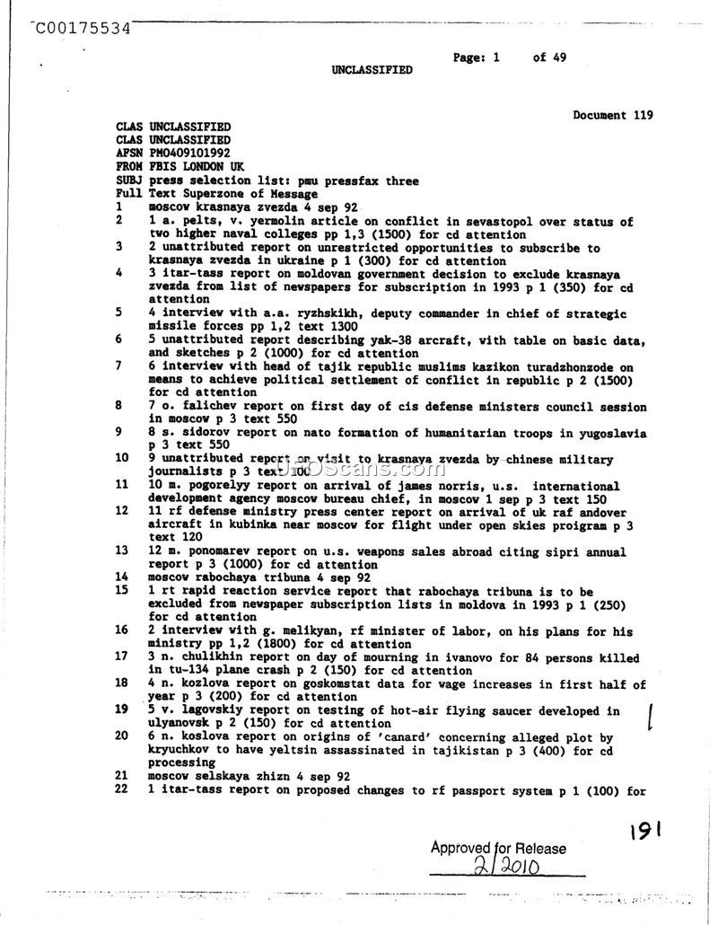This document is a press selection list issued by FBIS London UK on September 4, 1992. It provides a summary of various articles and reports from Russian newspapers, specifically Krasnaya Zvezda and Rabochaya Tribuna. The document covers a wide range of topics including military affairs, political conflicts in the former Soviet republics, international relations, and domestic economic data. Notable entries include a report on the testing of a 'hot-air flying saucer' in Ulyanovsk, an interview with the deputy commander in chief of the strategic missile forces, and reports on political developments involving figures such as Yeltsin and Kryuchkov. The document also mentions the arrival of U.S. International Development Agency bureau chief James Norris in Moscow and various administrative changes regarding newspaper subscriptions in Moldova.