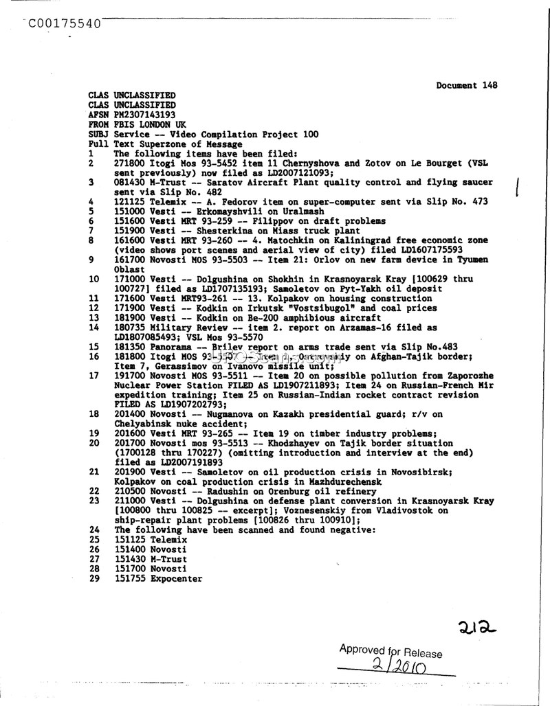 This document is a summary report from the Foreign Broadcast Information Service (FBIS) in London, detailing a video compilation project. The document lists 23 specific news items that have been filed, covering a wide range of topics across Russia and neighboring regions. These topics include industrial reports such as the Saratov Aircraft Plant, the Uralmash plant, the Miass truck plant, and ship-repair issues in Vladivostok. It also covers political and social issues, including the Kaliningrad free economic zone, housing construction, the Afghan-Tajik border situation, the Kazakh presidential guard, and the Russian-French Mir expedition training. Additionally, the document notes reports on environmental and safety concerns, such as the Zaporozhe Nuclear Power Station and a nuclear accident in Chelyabinsk. The document also lists several items that were scanned and found to be negative. The document is marked as unclassified and was approved for release in February 2010.