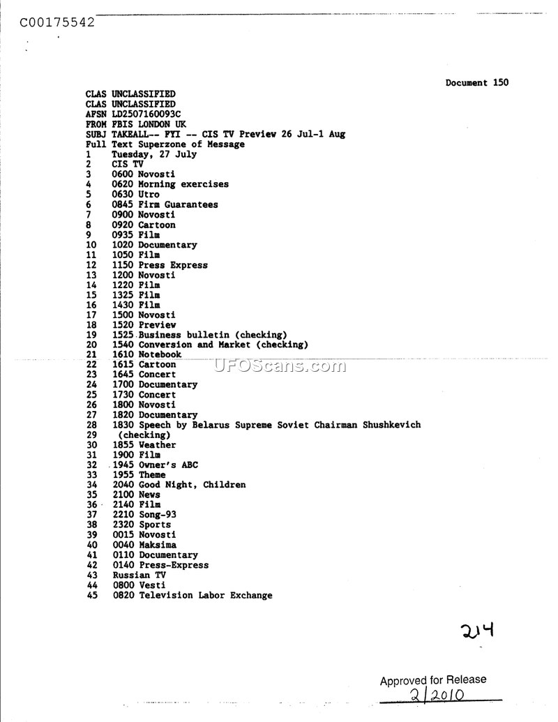 This document is an FBIS television programming schedule for the CIS dated July 27. It outlines various news, entertainment, and political broadcasts, including a speech by Belarus Supreme Soviet Chairman Shushkevich.