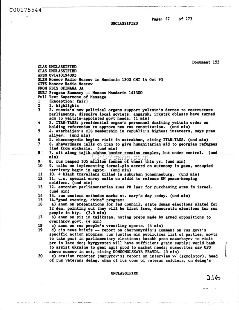 This document is a summary of a Moscow Radio Mandarin broadcast from October 14, 1993, compiled by FBIS Okinawa. The broadcast covers a variety of political and social news items concerning Russia and the surrounding region. Key topics include President Yeltsin's political restructuring efforts, Azerbaijan's membership in the CIS, humanitarian aid for Georgian refugees, and the ongoing situation along the Tajik-Afghan border. The report also mentions international developments, such as the Israel-PLO accord, the death of four travelers in Johannesburg, and arms procurement issues in Estonia. In the 'Good Evening, China' segment, the broadcast discusses upcoming Russian elections, wrestling sports, and various news briefs. Notably, the summary mentions that 'muscovites saw UFO above moscow in oct', citing the newspaper Komsomolskaya Pravda. The broadcast concludes with a report on an interview with Skmolotov, the head of a Russian veterans delegation.