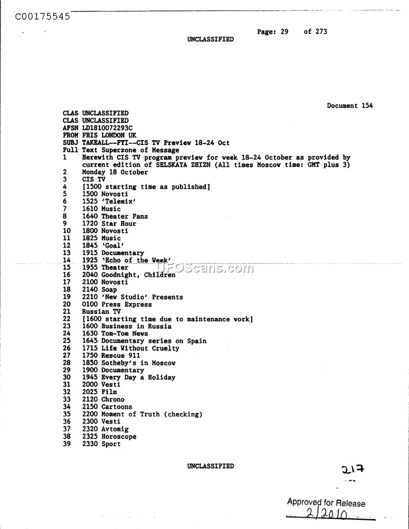 This document provides a television schedule for CIS TV for October 18, 1993, as reported by FBIS London. It lists various news and entertainment programs broadcast throughout the day.