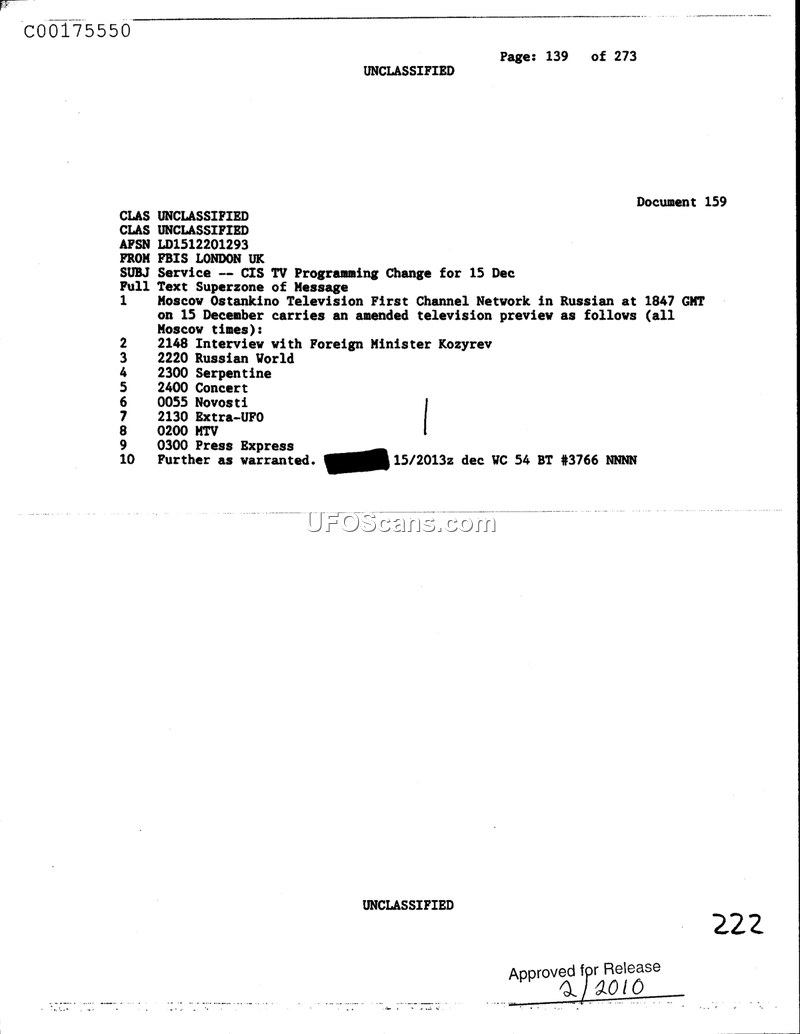 This document is an intelligence message transmitted by FBIS London UK regarding an amended television programming schedule for the Moscow Ostankino Television First Channel Network. The message outlines the broadcast schedule for 15 December, beginning at 1847 GMT. The schedule includes an interview with Foreign Minister Kozyrev at 2148, followed by 'Serpentine' at 2300, a concert at 2400, 'Novosti' at 0055, and a program titled 'Extra-UFO' at 2130. The document serves as a routine notification of media content changes within the Commonwealth of Independent States (CIS) television landscape.