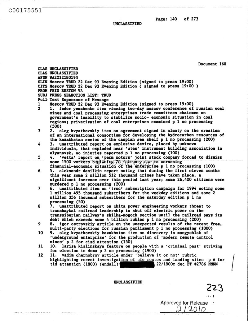 This document is an FBIS press summary of the December 22, 1993, edition of the Russian newspaper Trud. It covers various domestic issues, including a mention of an article by Vadim Chernobrov regarding UFO routes and landing sites.