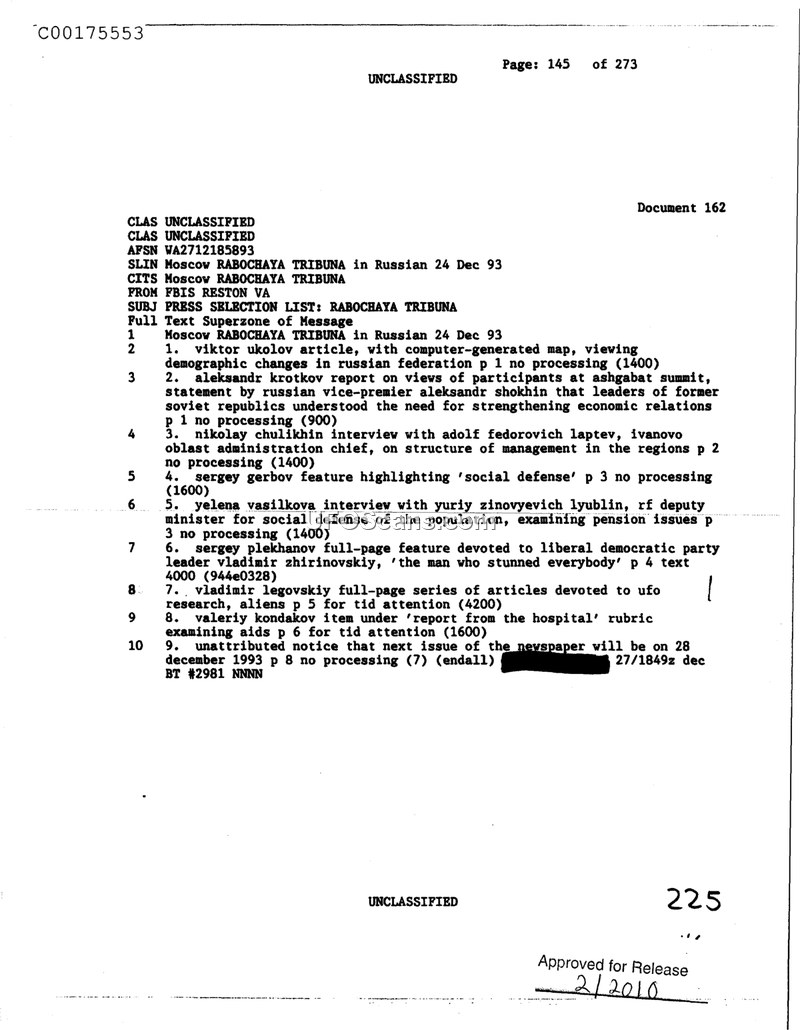 This document is an FBIS press selection list from December 1993 summarizing articles in the Russian newspaper Rabochaya Tribuna. It is notable for referencing a series of articles on UFO research and aliens published in that issue.