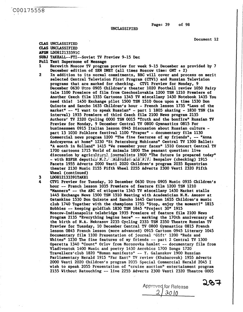 This document provides a detailed television programming schedule for Soviet Central Television (CTV1) and Russian Television for the week of 9-15 December. The information is derived from the 7 December edition of SEM DNEY. The schedule lists a variety of programs, including news, children's shows, documentaries, films from Czechoslovakia, and cultural programs. Notable entries include a meeting with Academician N.M. Amosov at Ostankino, a discussion on the 'peasant question' with RSFSR deputies N.P. Medvedev and V.V. Bespalov, and a program marking the 170th anniversary of the birth of N.A. Nekrasov. Additionally, the schedule references a 'Human manifesto' by Y. Galanskov. The document is marked as unclassified and was approved for release in February 2010.
