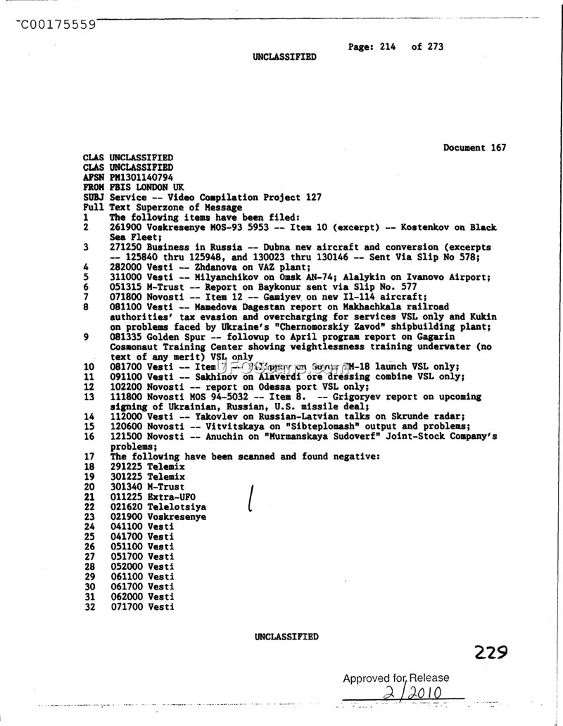 This document provides a summary of news items filed under Video Compilation Project 127 by FBIS London. It catalogs various reports on Russian and Ukrainian industrial, military, and political developments, while noting items that were scanned and found to be negative.