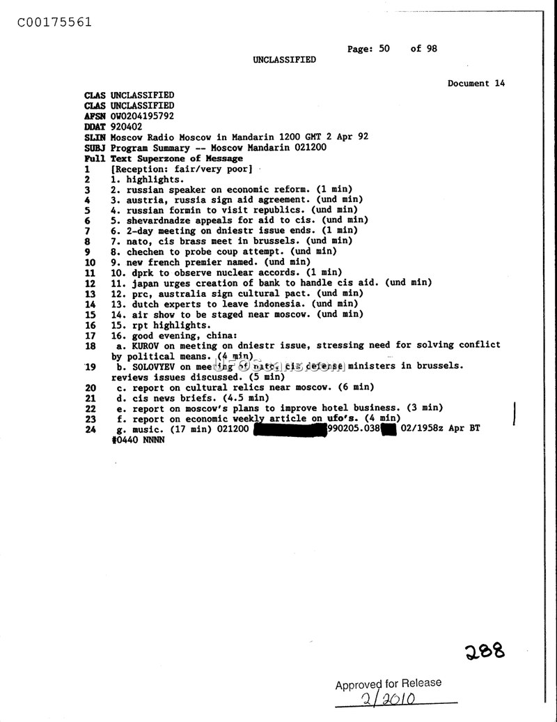 This document summarizes a Radio Moscow broadcast from April 2, 1992, covering geopolitical news and a mention of an article on UFOs.
