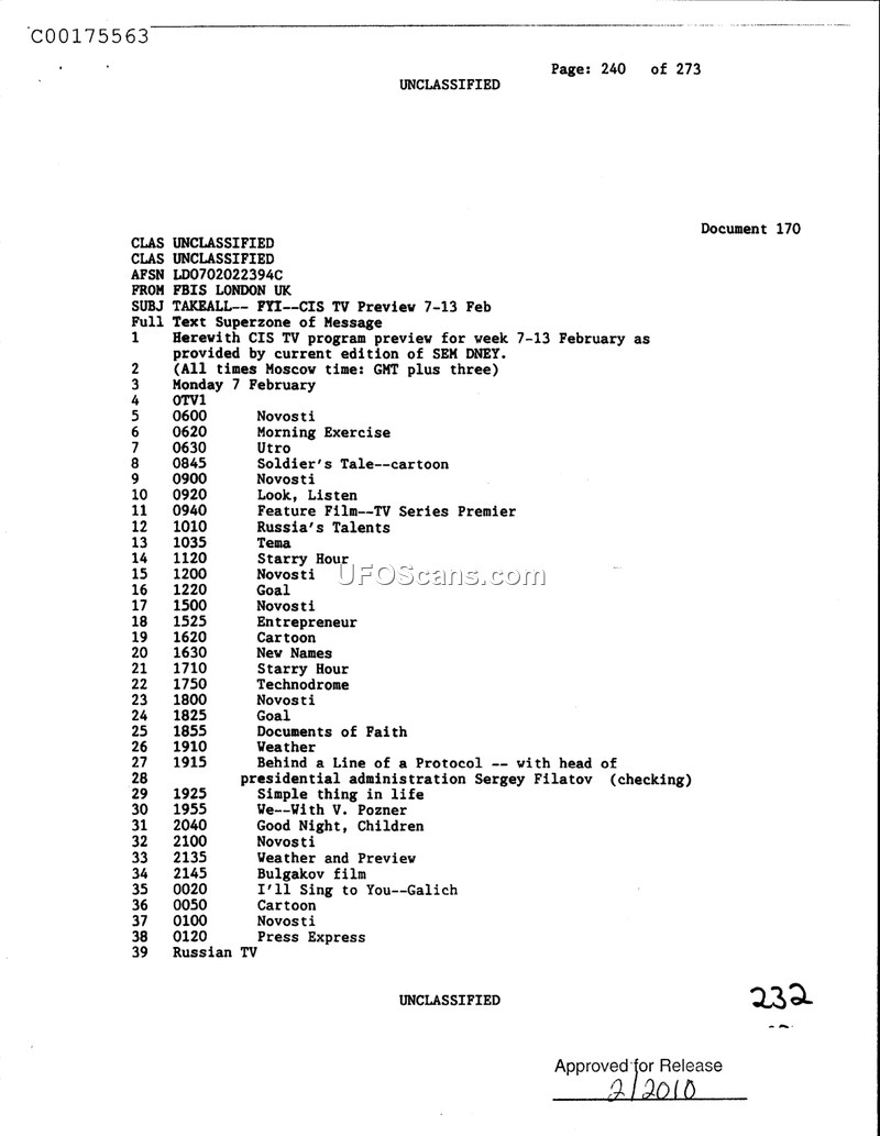 This document provides a television schedule for OTV1 in the CIS for the week of February 7-13. It serves as a routine media monitoring report from FBIS London.