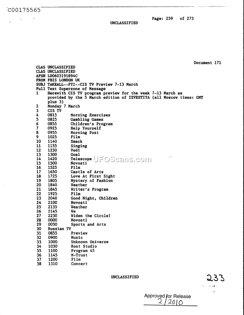 This document, issued by the Foreign Broadcast Information Service (FBIS) in London, provides a television program schedule for the Commonwealth of Independent States (CIS) for the week of March 7-13. The information was derived from the March 5 edition of the newspaper IZVESTIYA. The schedule lists specific programs for Monday, March 7, including morning exercises, various films, news broadcasts (Novosti), and programs such as 'Children's Program,' 'Help Yourself,' 'Morning Post,' 'Smack,' 'Singing,' 'Vedi,' 'Goal,' 'Telescope,' 'Castle of Arts,' 'Love At First Sight,' 'Mystery of Fashion,' 'Weather,' 'Writer's Program,' 'Good Night, Children,' 'We,' and 'Widen the Circle!' Additionally, the document lists a schedule for 'Russian TV' on the same day, featuring programs such as 'Preview,' 'Music,' 'Unknown Universe,' 'Rost Studio,' 'Program 45,' 'M-Trust,' 'Film,' and 'Concert.' All times are provided in GMT plus 3.