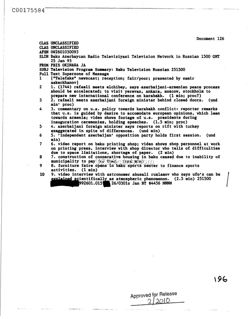 This document is an intelligence summary produced by FBIS Okinawa on January 25, 1993, detailing the contents of a broadcast from the Baku Azerbaycan Radio Televiziyasi network. The broadcast, titled 'Telefaks' and presented by Samir Askerkhanov, covered a variety of political and social topics in Azerbaijan. Key segments included reports on the Azerbaijani-Armenian peace process, meetings involving Rafaeli and Elchibey, and commentary on United States policy regarding the Karabakh conflict. The broadcast also touched upon domestic issues, such as the activities of an opposition party, challenges faced by a local printing shop, and the construction of cooperative housing. Notably, the final segment of the broadcast featured a video interview with an astronomer named Abusali Ruslamov. During this interview, Ruslamov asserted that UFOs can be explained scientifically as atmospheric phenomena.