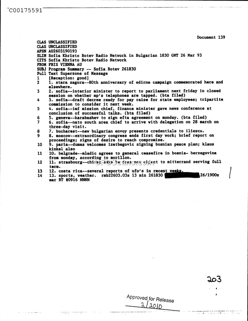 This document is a program summary issued by FBIS Vienna on March 26, 1993, detailing news reports from the Sofia Botev Radio Network. The summary covers a variety of international and domestic news items. Domestic Bulgarian news includes the commemoration of the 80th anniversary of the Edirne campaign, an upcoming closed session in parliament regarding the tapping of MP telephones, a draft decree concerning pay raises for state employees, and a news conference held by the IMF mission chief. International news items include the upcoming signing of an EFTA agreement in Geneva, a visit by a NATO south area chief to Sofia, the presentation of credentials by a new Bulgarian envoy in Bucharest, and progress at an extraordinary congress in Moscow. Additionally, the summary notes the signing of a Bosnian peace plan by Izetbegovic, a ceasefire agreement in Bosnia-Herzegovina involving Mladic, and comments by Chirac regarding Mitterrand. Finally, the report includes a brief mention of several reports of UFOs in Costa Rica in recent weeks.
