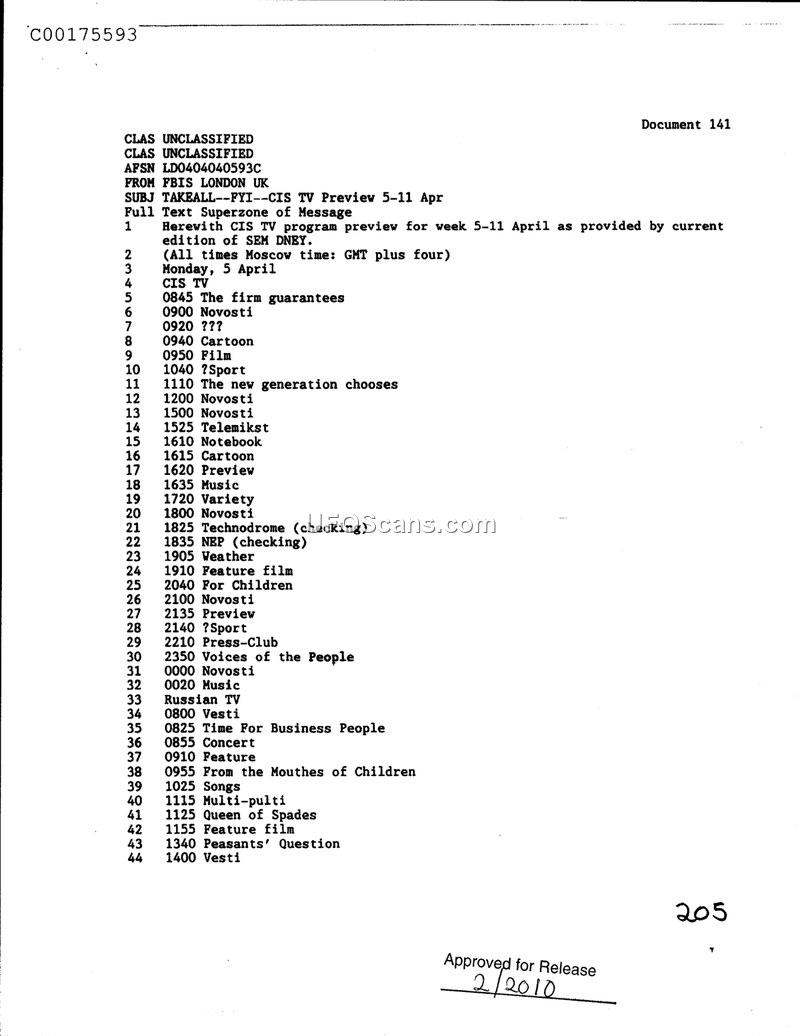 This document is a Foreign Broadcast Information Service (FBIS) transmission from London, UK, providing a television program preview for the Commonwealth of Independent States (CIS) for the week of April 5th through April 11th. The document specifies that all listed times are in Moscow time, defined as GMT plus four. The content provides a detailed schedule for Monday, April 5th, for both CIS TV and Russian TV. The CIS TV schedule includes various programs such as 'Novosti' (news), 'Cartoon', 'Film', 'Sport', 'The new generation chooses', 'Telemikst', 'Notebook', 'Preview', 'Music', 'Variety', 'Technodrome', 'NEP', 'Weather', 'Feature film', 'For Children', 'Press-Club', and 'Voices of the People'. The Russian TV schedule for the same day includes 'Vesti', 'Time For Business People', 'Concert', 'Feature', 'From the Mouthes of Children', 'Songs', 'Multi-pulti', 'Queen of Spades', 'Feature film', and 'Peasants' Question'. The document is marked as unclassified and was approved for release in February 2010.