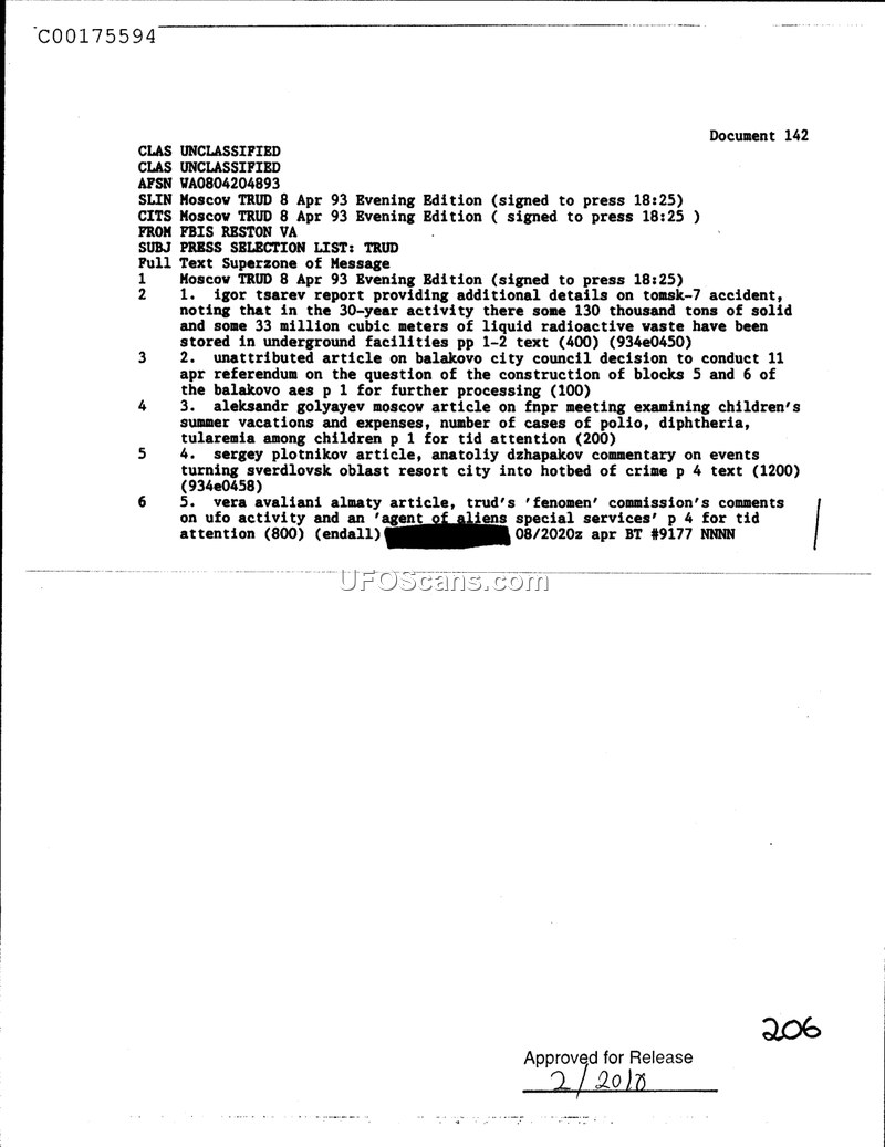 This document is a press selection list issued by FBIS Reston, VA, on April 8, 1993, summarizing the evening edition of the Moscow newspaper TRUD. The document outlines five specific items covered in the newspaper. The first item is a report by Igor Tsarev regarding the Tomsk-7 accident, detailing the storage of solid and liquid radioactive waste. The second item concerns a Balakovo city council decision regarding a referendum on the construction of blocks 5 and 6 of the Balakovo AES. The third item is an article by Aleksandr Golyayev regarding an FNPR meeting on children's summer vacations and health issues. The fourth item is an article by Sergey Plotnikov with commentary by Anatoliy Dzhapakov concerning events in a Sverdlovsk Oblast resort city. The final item is an article by Vera Avaliani from Almaty, which discusses comments made by TRUD's 'Fenomen' commission regarding UFO activity and an 'agent of aliens special services'.