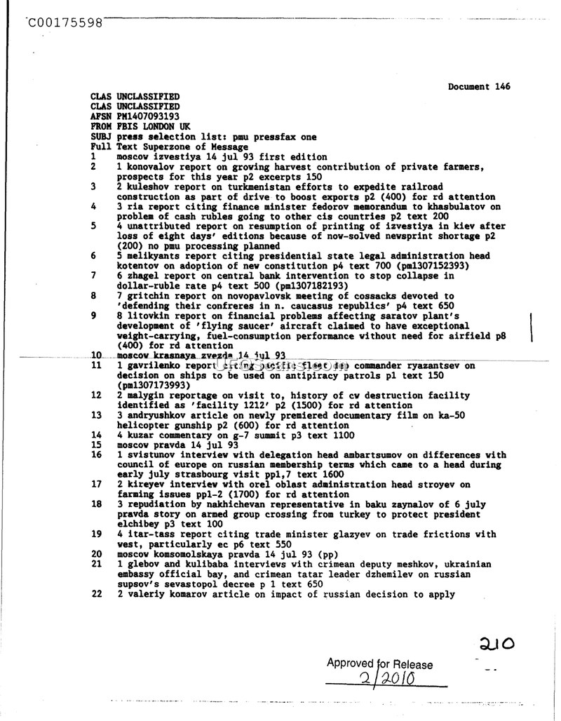 This document is a press selection list issued by FBIS London UK on July 14, 1993. It provides a summary of various news reports from Russian publications, including Izvestia, Krasnaya Zvezda, Pravda, and Komsomolskaya Pravda. The reports cover a wide range of topics relevant to the political and economic climate of Russia in mid-1993. Economic issues are prominent, with reports on harvest contributions, railroad construction in Turkmenistan, cash ruble problems, central bank interventions, and trade frictions with the West. Political developments include discussions on the new Russian constitution, the G-7 summit, and diplomatic relations with the Council of Europe. Military and security matters are also addressed, such as the Pacific Fleet's antipiracy patrols, the history of a chemical weapons destruction facility, and a documentary on the Ka-50 helicopter gunship. Additionally, the list notes a report by Litovkin regarding financial difficulties affecting the Saratov plant's development of a 'flying saucer' aircraft, which is claimed to have exceptional weight-carrying and fuel-consumption performance without the need for an airfield. Regional tensions are highlighted through reports on Cossack meetings in the Caucasus, armed groups crossing from Turkey, and the political situation in Crimea involving local leaders and the Russian Sevastopol decree.