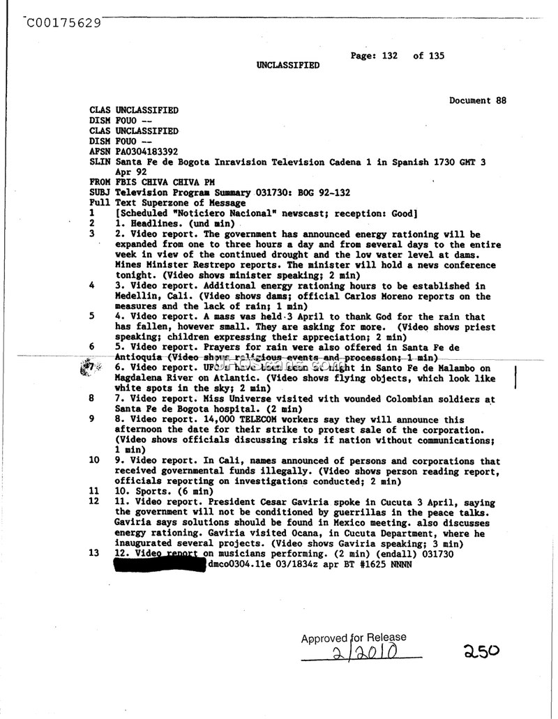 This document summarizes a Colombian television news broadcast from April 3, 1992. It includes a brief report on unidentified flying objects observed at night in Santo Fe de Malambo.