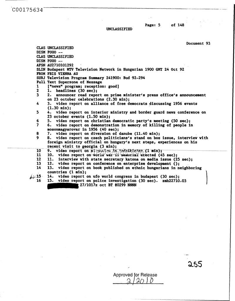 This document provides a summary of a Budapest MTV television broadcast from October 24, 1992. It lists various news segments, including a report on a UFO world congress in Budapest.