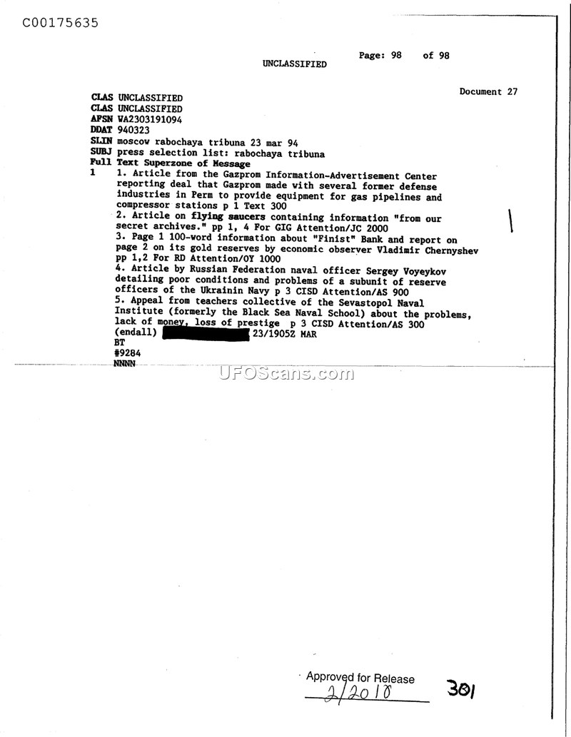 This document provides a summary of five news items from the March 23, 1994, edition of Rabochaya Tribuna, covering topics ranging from industrial deals and banking to military conditions and a mention of flying saucers.