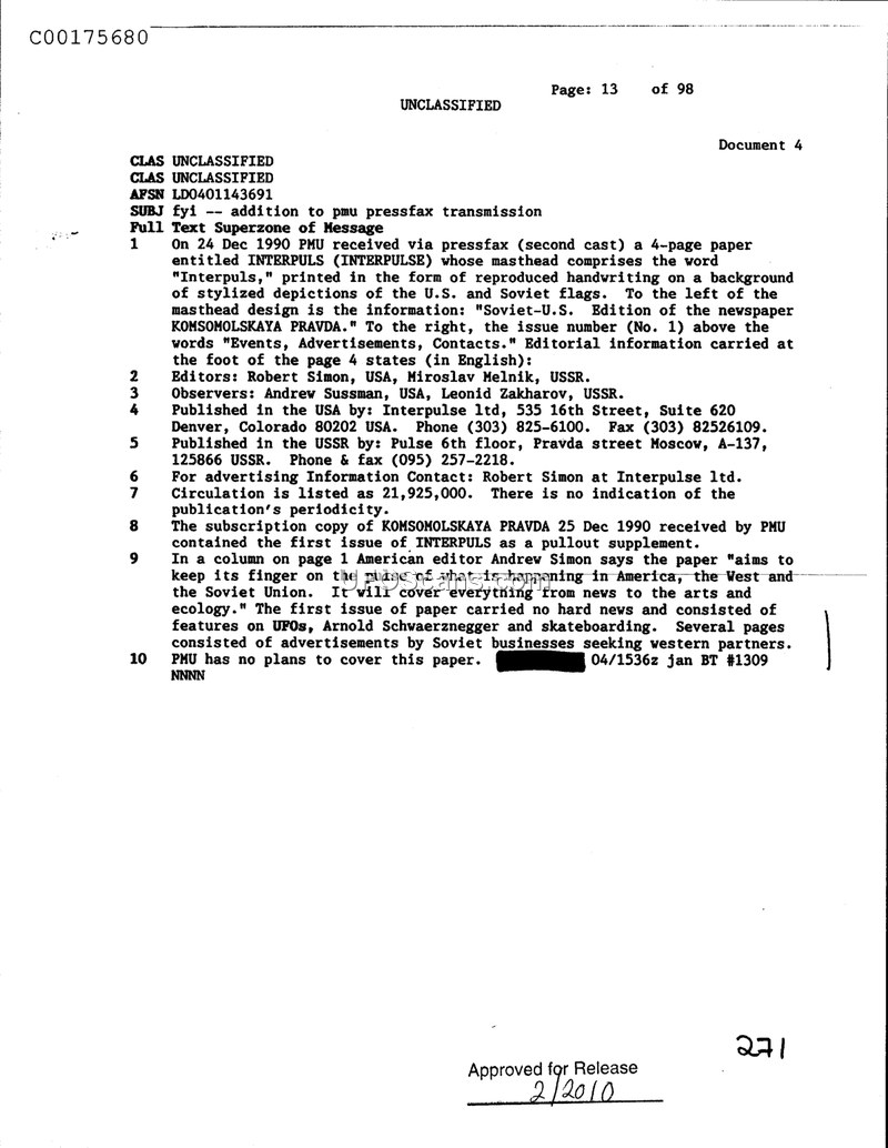 This document, dated January 1991, serves as an intelligence update regarding the emergence of a new publication titled INTERPULS. On December 24, 1990, the PMU received a four-page paper via pressfax. The publication, which features a masthead displaying both U.S. and Soviet flags, is identified as a Soviet-U.S. edition of the newspaper KOMSOMOLSKAYA PRAVDA. The editorial team consists of Robert Simon in the USA and Miroslav Melnik in the USSR, with Andrew Sussman and Leonid Zakharov serving as observers. The paper is published by Interpulse Ltd in Denver, Colorado, and by Pulse in Moscow. The first issue, which appeared as a pullout supplement in the December 25, 1990, edition of KOMSOMOLSKAYA PRAVDA, claims to focus on events in America, the West, and the Soviet Union, covering topics ranging from news to arts and ecology. Notably, the first issue included features on UFOs, Arnold Schwaerznegger, and skateboarding, alongside advertisements from Soviet businesses seeking Western partners. The document concludes by noting that the PMU has no intention of monitoring or covering this publication further.