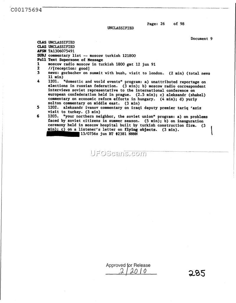 This document provides a summary of a Moscow Radio broadcast from June 12, 1991, covering various political and social topics. It includes a brief mention of a listener's letter concerning flying objects.