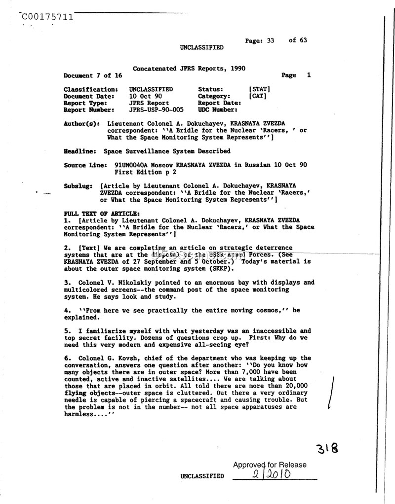 This document is a JPRS report from October 10, 1990, detailing the capabilities of the Soviet Union's outer space monitoring system, known as SKKP. The report, authored by Lieutenant Colonel A. Dokuchayev for the publication KRASNAYA ZVEZDA, provides a brief look into the command post of this strategic system. During a visit to the facility, the author is shown an enormous bay filled with multicolored screens and displays that allow operators to monitor the 'moving cosmos.' Colonel V. Nikolskiy, who guides the tour, emphasizes the facility's ability to observe space. Colonel G. Kovsh, the chief of the department, provides statistics regarding the objects being tracked. He notes that more than 7,000 objects have been counted in outer space, including both active and inactive satellites. He further estimates that there are more than 20,000 objects in total currently in orbit. The report highlights the potential hazards of this orbital clutter, noting that even an ordinary needle could pierce a spacecraft, though it clarifies that not all space apparatuses are considered harmless.