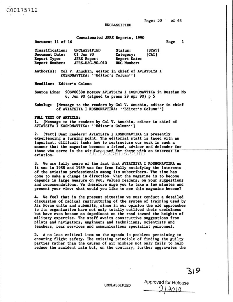 This document is an excerpt from a 1990 Joint Publications Research Service (JPRS) report, specifically an 'Editor's Column' from the magazine AVIATSIYA I KOSMONAVTIKA, authored by Colonel V. Anuchin. The text serves as a formal address to the magazine's readership, announcing a significant shift in the publication's editorial direction. Colonel Anuchin admits that the magazine's output during 1988 and 1989 failed to meet the expectations of its professional aviation audience. Consequently, the editorial staff is seeking input from readers to transform the magazine into a more effective resource for Air Force personnel and those interested in aviation. The document outlines two primary areas of focus for the magazine's future content: the radical restructuring of military training systems and the improvement of flight safety protocols. Regarding flight safety, the editor criticizes the prevailing Soviet approach of focusing on identifying 'guilty parties' after an accident, arguing that this method is ineffective at reducing accident rates and instead exacerbates the underlying problems. The editor calls for constructive feedback from pilots, navigators, engineers, technicians, scientists, and support personnel to guide the magazine's new trajectory.