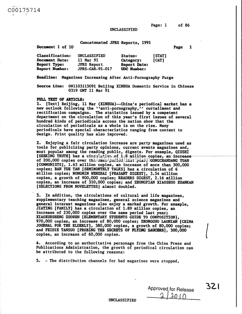 This document is a JPRS report dated March 11, 1991, detailing the state of the periodical market in China. According to statistics issued by a competent department, the circulation of periodicals across the nation has seen an increase following the implementation of 'anti-pornography' and rectification campaigns. The report highlights that the print quality and content design of these publications have improved. Specific examples of magazines experiencing circulation growth are provided, including party-affiliated publications like QIUSHU (SEEKING TRUTH) and GONGCHANDANG YUAN (COMMUNISTS), as well as general interest and cultural magazines such as JIATING (FAMILY) and FEIDIE TANSUO (PROBING THE SECRETS OF FLYING SAUCERS). The China Press and Publications Administration attributes this growth to several factors, the first of which is the cessation of distribution channels for 'bad' magazines.