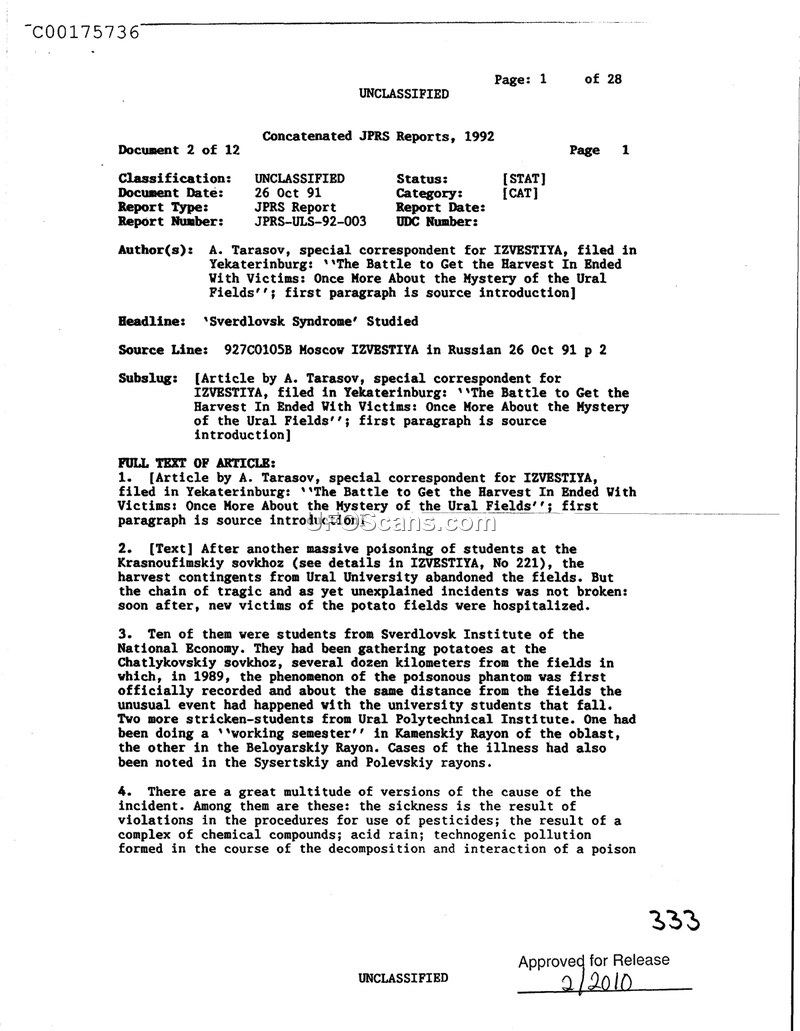 This document reports on recurring, unexplained mass poisonings of students during potato harvests in the Ural region between 1989 and 1991. It outlines various environmental and chemical theories being investigated to explain the phenomenon.
