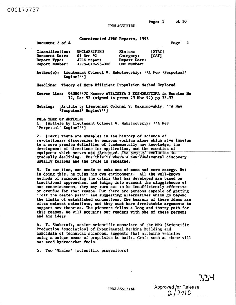 This document is a JPRS report from December 1992, authored by Lieutenant Colonel V. Maksimovskiy. It discusses the history of scientific discovery and the necessity for new, more efficient energy and propulsion methods to address environmental concerns and the limitations of traditional approaches. The report highlights the work of V. Shabetnik, a senior scientific associate at the NPO of Experimental Machine Building. Shabetnik, a candidate of technical sciences, suggests that it is possible to construct airborne vehicles that utilize a unique propulsion method, thereby eliminating the need for hydrocarbon fuels. The text serves as an introduction to Shabetnik's ideas, framing them as a departure from established scientific conceptions.