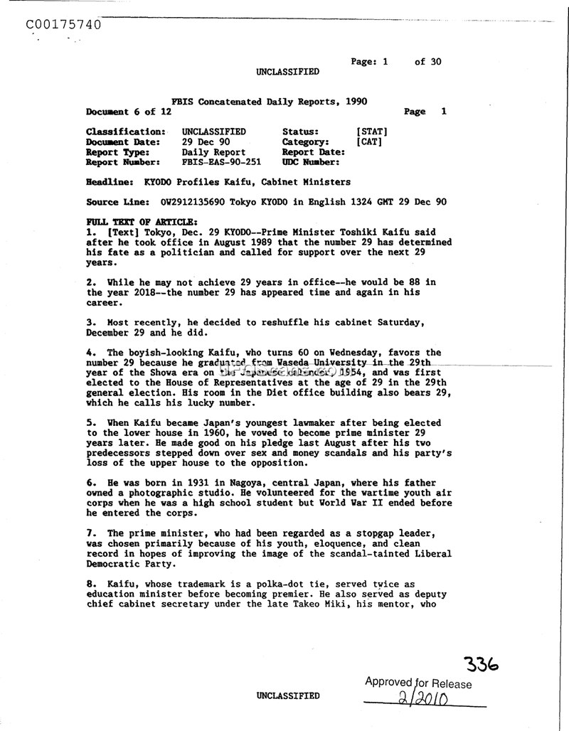 This FBIS report profiles Japanese Prime Minister Toshiki Kaifu, focusing on his political career, his personal association with the number 29, and his rise to leadership within the Liberal Democratic Party.