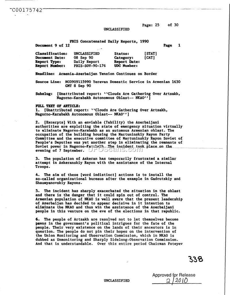 This document, a daily report from the Foreign Broadcast Information Service (FBIS) dated September 8, 1990, details the deteriorating political situation in the Nagorno-Karabakh Autonomous Oblast (NKAO). The report highlights an incident occurring on the evening of September 7, 1990, in which Azerbaijani authorities occupied the Martuninskiy Rayon Party Committee and the executive committee of the Martuninskiy Rayon Soviet of People's Deputies. This action is described as part of a broader effort by Azerbaijani authorities to eliminate the NKAO as an autonomous Armenian oblast and dismantle the remnants of Soviet power in the region. The report notes that the population of Askeran, with the assistance of Internal Troops, successfully resisted a similar attempt in the Askeranskiy Rayon. Furthermore, the document mentions that the Armenian population of the NKAO is deeply concerned about the Azerbaijani leadership's intentions to eliminate the NKAO ahead of upcoming elections. The people of Artsakh are described as feeling abandoned, expressing a lack of faith in the Union Monitoring and Observation Commission, which they refer to as the 'Unmonitoring and Sharply Sidelong-Observation Commission.' The report concludes by noting the ongoing political tension and the fear that the situation could spiral out of control.