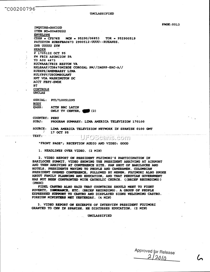 This document is a Foreign Broadcast Information Service (FBIS) summary of a television broadcast from Lima America Television, dated October 17, 1995. The report details the contents of a news program that covered the Bariloche Summit. The broadcast included video footage of Peruvian President Fujimori arriving at the airport and the conference site. It noted that the Colombian President opened the conference, followed by President Menem. The report also mentions that President Fujimori discussed family planning and education, and addressed the relationship between the Peruvian government and the Catholic Church. Additionally, the broadcast featured comments from Fidel Castro regarding the need for countries to combat poverty and ignorance, noting that a group of people expressed support for him. Finally, the summary mentions a video report featuring excerpts of an interview President Fujimori granted to CNN in Spanish, where he discussed education.