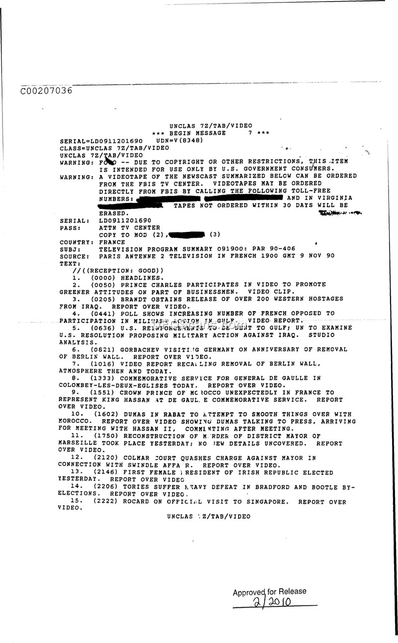 This document is a summary of a television broadcast from Paris Antenne 2, dated November 9, 1990, at 1900 GMT. The report, designated as PAR 90-406, provides a brief overview of fifteen news segments. The topics covered include Prince Charles promoting environmental attitudes among businessmen, Brandt's efforts in securing the release of Western hostages from Iraq, and public opposition in France regarding military involvement in the Gulf. The broadcast also covered international political events, such as Mikhail Gorbachev's visit to Germany for the anniversary of the Berlin Wall's removal, and a commemorative service for General De Gaulle in Colombey-les-Deux-Eglises, which was attended by the Crown Prince of Morocco. Additionally, the report mentions diplomatic efforts by Dumas in Rabat to improve relations with Morocco, legal developments concerning the mayor of Marseille, the election of the first female president of the Irish Republic, political defeats for the Tories in the UK, and an official visit to Singapore by Rocard.