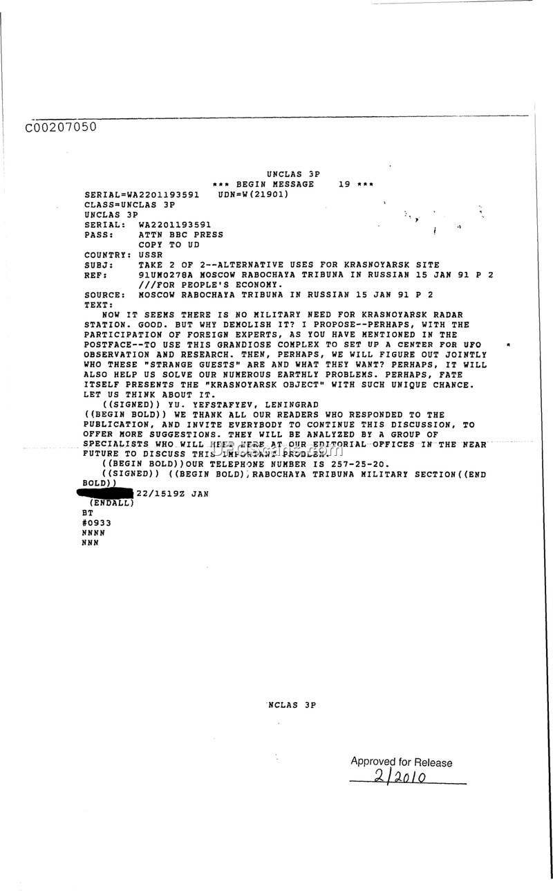 This document is a message regarding the future of the Krasnoyarsk radar station in the USSR. The author, Yu. Yefstafyev of Leningrad, argues against the demolition of the facility, which is deemed to have no further military necessity. Instead, Yefstafyev suggests that the site be converted into a center for UFO observation and research, involving the participation of foreign experts. The author posits that such a center could help address both the mystery of 'strange guests' and various earthly problems. The message concludes by noting that the Rabochaya Tribuna military section will analyze further suggestions from readers and plans to convene a group of specialists to discuss the matter.