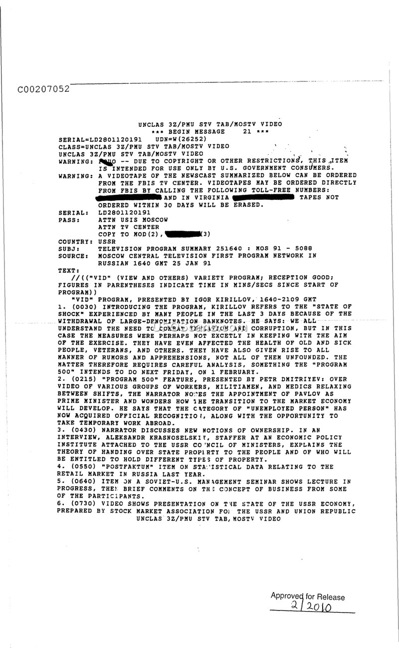 This document is a summary of a television broadcast from the Moscow Central Television First Program Network, dated January 25, 1991. The broadcast, titled 'VID', was presented by Igor Kirillov and covered various socio-economic issues facing the Soviet Union at the time. The program began by addressing the 'state of shock' felt by the population due to the withdrawal of large-denomination banknotes, an action intended to combat inflation and corruption but which caused significant public apprehension. The 'PROGRAM 500' feature, presented by Petr Dmitriyev, highlighted the appointment of Pavlov as Prime Minister and discussed the transition to a market economy, noting the emergence of the 'unemployed person' category. Further segments included an interview with Aleksandr Krasnoselskiy regarding new notions of property ownership, a 'POSTFAKTUM' report on statistical data concerning the Russian retail market, and coverage of a Soviet-U.S. management seminar. The broadcast concluded with a presentation on the state of the USSR economy prepared by the Stock Market Association for the USSR and Union Republics.