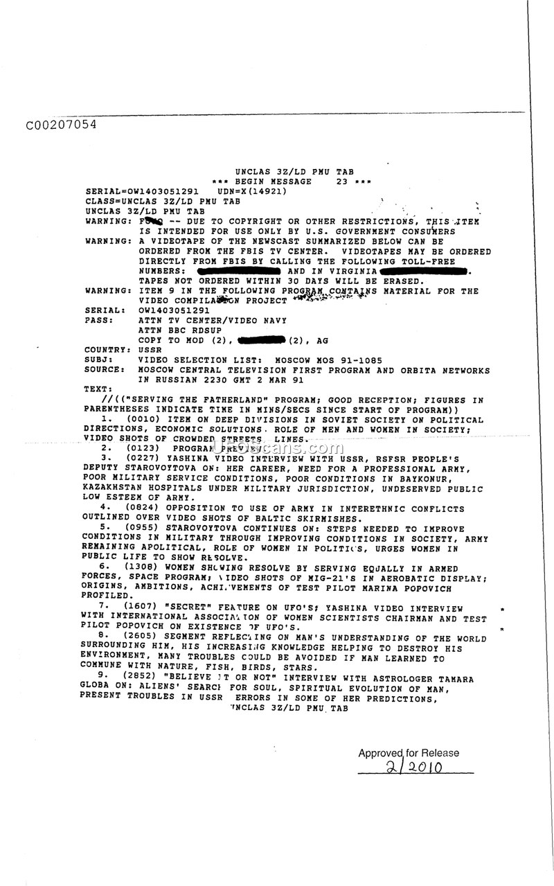 This document is a video selection list (MOS 91-1085) produced by the FBIS TV Center, dated March 2, 1991. It summarizes the contents of a broadcast from the Moscow Central Television First Program and Orbita Networks. The broadcast, titled 'Serving the Fatherland,' covers a variety of political and social topics within the USSR. Key segments include an interview with People's Deputy Starovoytova regarding military conditions and political divisions, a profile of test pilot Marina Popovich, and a 'secret' feature on UFOs. The UFO segment involves an interview with Popovich regarding the existence of UFOs and the International Association of Women Scientists. Additionally, the broadcast features an interview with astrologer Tamara Globa, who discusses the spiritual evolution of man and the search for the soul in relation to aliens. The document serves as a catalog for U.S. government consumers to order specific segments of the broadcast.