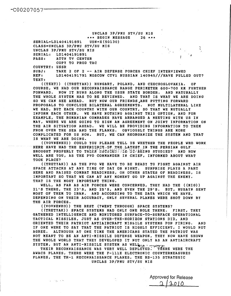 This document is a transcript of an interview with the Commander in Chief of the Soviet Air Defense Forces (PVO), identified as Tretyak, conducted by Vovnenko. The discussion centers on the strategic reorganization of Soviet air defense, specifically noting a contraction of the reconnaissance perimeter from 600-700 km forward to the USSR state border. Tretyak emphasizes the importance of establishing bilateral agreements with neighboring nations, such as Hungary, Poland, and Czechoslovakia, to facilitate the mutual exchange of information regarding the air situation. The interview also touches upon the Persian Gulf conflict, where Tretyak discusses the fate of Iraqi aircraft, noting that Husayn transferred most of them to Iran. Furthermore, Tretyak provides a critical assessment of the American Patriot missile system. He disputes the notion that the Patriot is highly efficient and asserts that while the Americans initially claimed it was an antiaircraft weapon, it has demonstrated capabilities as an anti-missile system. The document concludes with a brief mention of the deployment of various American reconnaissance and electronic warfare assets, including AWACS, F-111E, TR-1, and RS-135 aircraft.