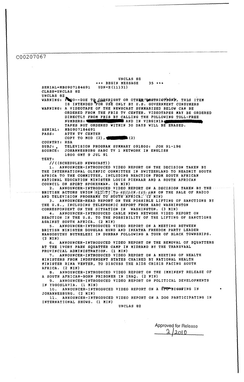 This document is a summary of a television broadcast from the Johannesburg SABC TV 1 network, dated July 9, 1991. The broadcast covered a variety of political and social issues relevant to South Africa at the time. Key topics included the International Olympic Committee's decision regarding South Africa's readmission, the British Actors Union Equity's ban on radio and television programs in South Africa, and the potential lifting of U.S. sanctions. The report also detailed a meeting between British Minister Douglas Hurd and Inkatha Freedom Party leader Mangosuthu Buthelezi, as well as discussions regarding the AIDS crisis led by National Health Minister Rina Venter. Among the eleven segments listed, item number ten is noted as an 'announcer-introduced video report on a UFO sighting in Johannesburg,' with a duration of two minutes.