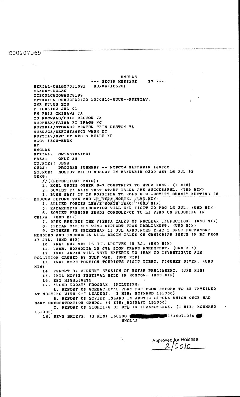 This document is a Foreign Broadcast Information Service (FBIS) summary of a Radio Moscow broadcast in Mandarin, dated July 16, 1991. The report provides a brief overview of eighteen news items covered in the broadcast. The topics range from international diplomacy and economic affairs to regional conflicts and environmental issues. Key international developments mentioned include German Chancellor Kohl's efforts to secure G-7 aid for the Soviet Union, the success of START talks, and President Bush's comments regarding a potential U.S.-Soviet summit. The report also covers regional news, such as the DPRK resuming nuclear inspection talks in Vienna, the arrival of Hun Sen in Beijing, and a trade agreement between the USSR and Mongolia. Domestic Soviet news includes a report on the RSFSR Parliament and a segment on Gorbachev's economic reform plans. Notably, item 17C mentions a report on a UFO sighting in Krasnoyarsk. The document concludes with a list of news briefs.