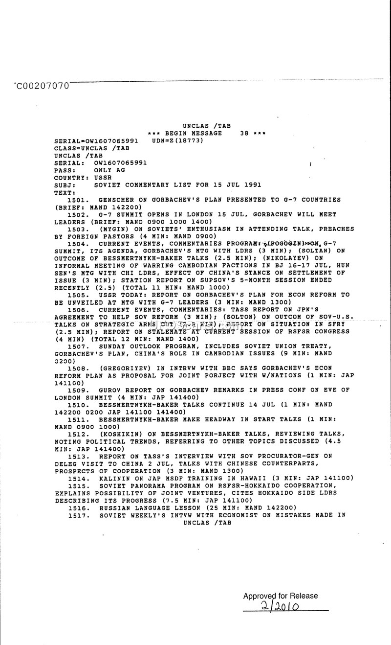 This document is a daily digest of Soviet media and official reporting from July 15, 1991. It highlights key diplomatic events including the G-7 summit, US-Soviet arms talks, and regional political developments in Cambodia and Japan.