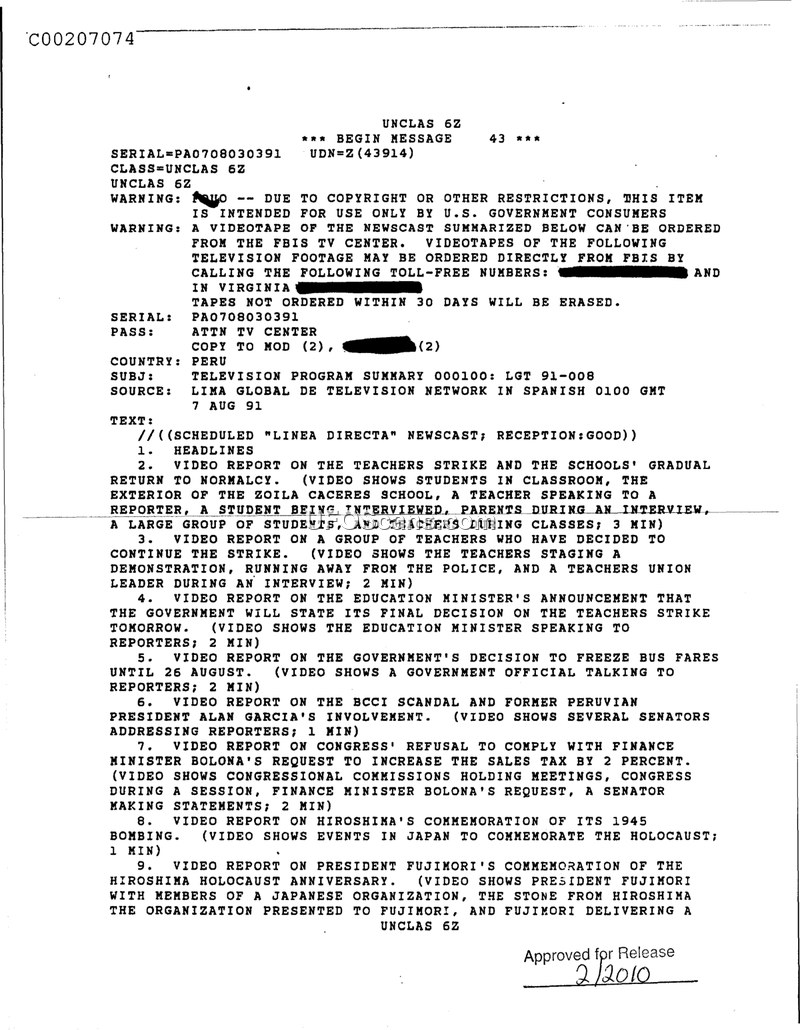 This document summarizes the August 7, 1991, 'Linea Directa' newscast from Peru, covering political and social issues including a teachers' strike, the BCCI scandal, and President Fujimori's activities. It serves as an official record of television content monitored by the FBIS TV Center.