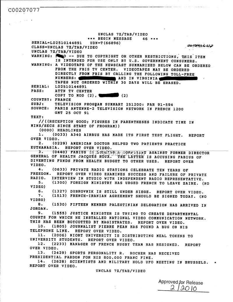 This document is a television program summary produced by the FBIS TV Center, dated October 25, 1991. It provides a brief overview of news segments broadcast by the Paris Antenne-2 Television Network at 1200 GMT on that day. The summary covers a wide range of topics, including the first test flight of the A340 Airbus, a medical ethics case involving euthanasia, a political dispute involving former Director General of Health Jacques Roux and Fabius, and the tenth anniversary of private radio stations in France. International news includes the siege of Dubrovnik, a French-Iranian agreement, and the arrival of a Palestinian delegation in Jordan. Domestic French news items include the creation of departmental courts, a bug found on the telephone line of journalist Pierre Pean, the distribution of meal tokens at Niort University, the resignation of the French rugby team manager, and a presidential pardon for sports personality R. Rocher. Notably, item 14 mentions that scientists and military personnel held a UFO meeting in Brussels.
