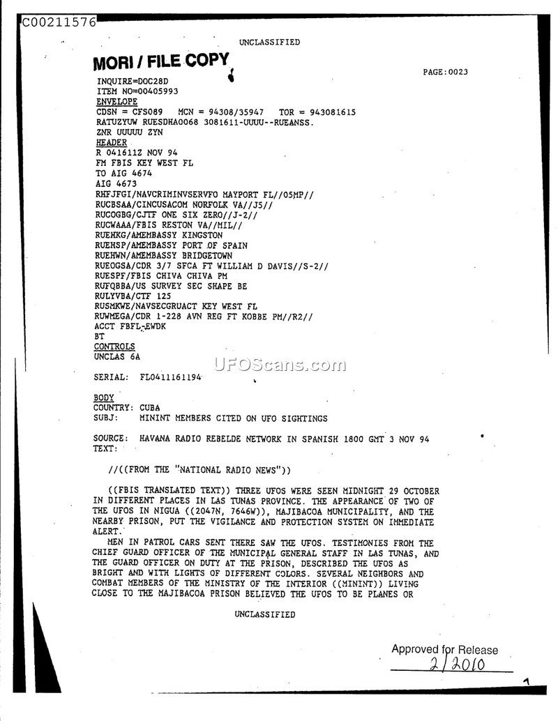This intelligence report, issued by FBIS Key West on November 4, 1994, details a series of UFO sightings that occurred in the Las Tunas Province of Cuba on the night of October 29, 1994. According to a broadcast from the Havana Radio Rebelde Network, three unidentified aerial phenomena were observed at midnight in various locations within the province. Specifically, the appearance of two of these objects near the Nigua area (2047N, 7646W) in the Majibacoa municipality and a nearby prison caused the local vigilance and protection system to be placed on immediate alert. Witnesses to the event included members of the municipal general staff and prison guard officers. These individuals described the objects as bright and displaying different colors. Additionally, neighbors living near the Majibacoa prison, who were also members of the Ministry of the Interior (MININT), observed the phenomena and initially speculated that the objects might be aircraft.