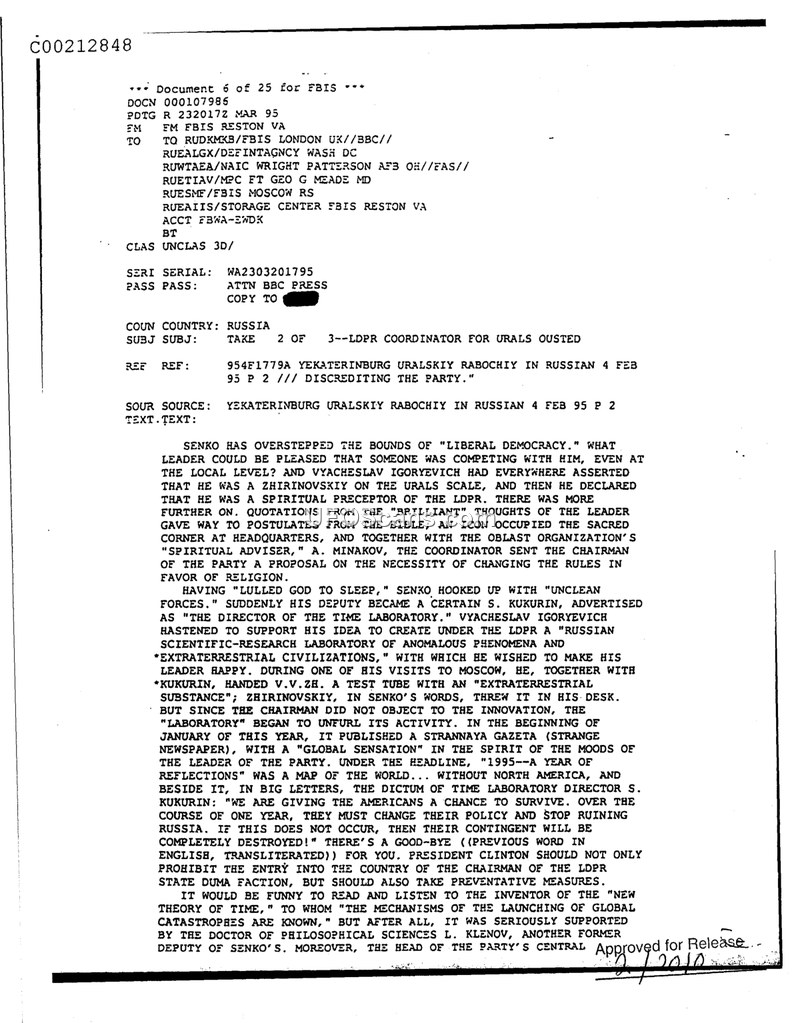 This intelligence report, dated March 23, 1995, details the political downfall of an LDPR coordinator named Senko in the Urals region of Russia. The report highlights Senko's deviation from party norms, specifically his attempt to influence the party's stance on religion and his association with a deputy named S. Kukurin. Kukurin, who styled himself as the 'Director of the Time Laboratory,' established the 'Russian Scientific-Research Laboratory of Anomalous Phenomena' in an effort to appeal to the party leader, Zhirinovskiy. The document notes that Kukurin presented Zhirinovskiy with a test tube containing an 'extraterrestrial substance.' Furthermore, the laboratory published a newspaper called 'Strannaya Gazeta' (Strange Newspaper), which featured claims regarding the survival of the United States and global catastrophes. The report mentions that these theories were supported by L. Klenov, a Doctor of Philosophical Sciences. The document serves as a summary of internal political friction within the LDPR, framed by the bizarre activities of its regional members regarding anomalous phenomena.